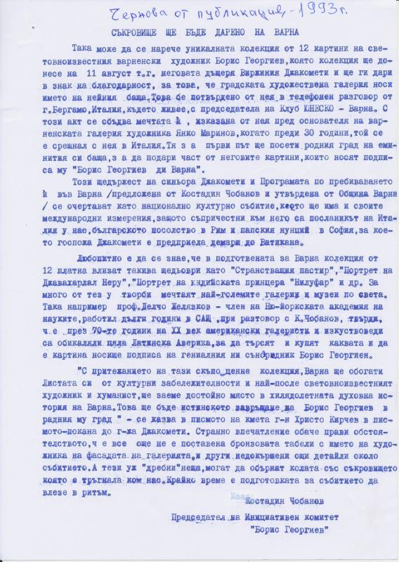- Инициатива на дар за Варна от 13 шедьовъра от световния известния художник и хуманист Борис Георгиев –геният от Варна