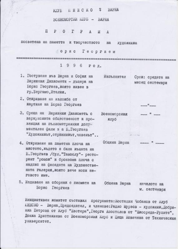 Да се спрем на още един важен момент от дейността на клуба – организиране посещението на Вирджиния Джакомети – дъщеря на Борис Георгиев във Варна. В качеството си на председател на клуб ЮНЕСКО Костадин Чобанов направи предложение на Общинския съвет на града, паметта на великия художник да бъде увековечена, като на негово име бъде кръстена Градската художествена галерия. За тази цел се формира инициативен комитет, в който се включиха известни варненски и софийски дейци на културата. Предложението бе силно подкрепено от общинския съветник от СДС – Славейко Кондов – един високо диалогичен и културен човек.