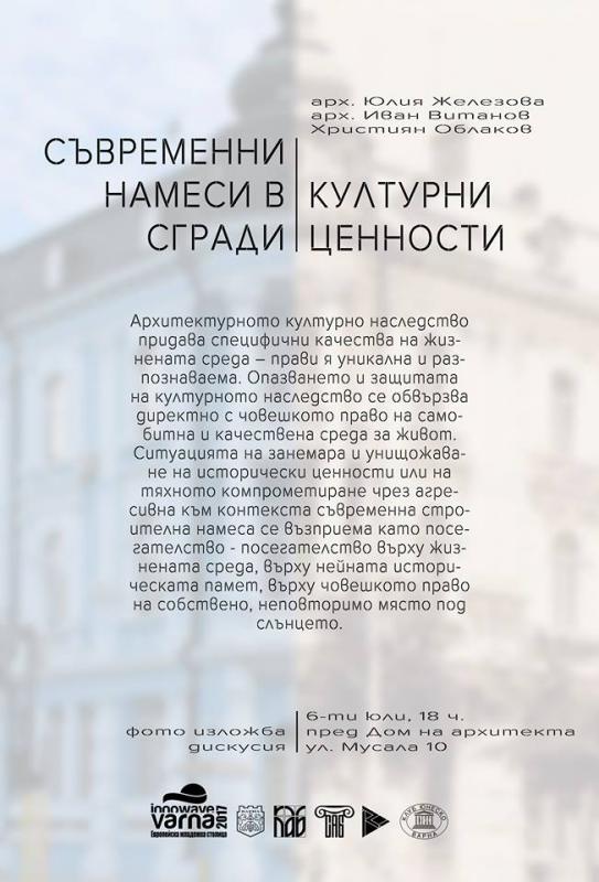 Клуб UNSECO Варна Ви кани на фото-изложба и дискусия "Съвременни намеси в сгради - културни ценности" с автори арх. Юлия Железова, арх. Иван Витанов, Християн Облаков. Откриването е на 6-ти юли 2017 от 18:00 ч., пл."Мусала" 10 - пред "Дом на архитекта".